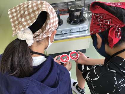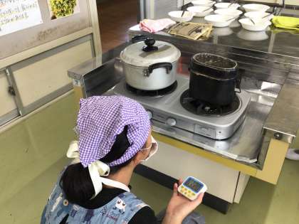 キャンプ当日を想定して、カレーに合う「水分が少ない、少しかためのご飯」を目指して、飯盒でご飯を炊きました。自分たちで水の量や加熱時間を考えて、実践しました。計画通り加熱するために、タイマーを片時も離さず、火加減をよく見ながら、一生懸命に準備することができました!