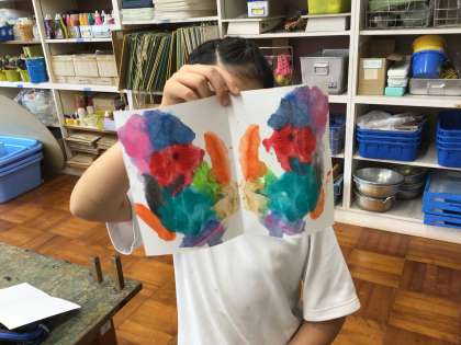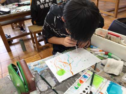 図画工作科の学習で、「にじうおのさかな」という本を題材とした読書感想画に取り組んでいます。にじうおの綺麗なうろこを作るために、デカルコマニー、ドリッピング、スパッタリングという3つの技法を使って模様を作りました。