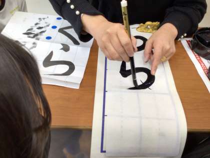 12月17日(火)、物部先生に書き初めを教えていただきました。字を反対側から書いて、説明していただきました。それぞれの字のコツも教えていただきました。一画ずつ、止めて、動かして、止める(はらう)のが、とても丁寧で、美しくて、息を止めて見とっていました。その後の練習では、とても集中していい字が書けました。