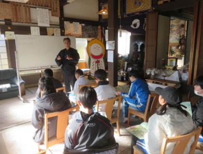 12月11日、6年生が花山の地名の歴史について学ぶために妙楽寺に行きました。花沢1組の花園町と2組の柵之沢村の花と沢をとって花沢町となったこと、その花沢の花と下山村の山をとって花山という地名になったことを知り、驚きました。花山の魅力を、ほかにもたくさん知ることができました。
