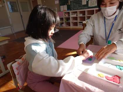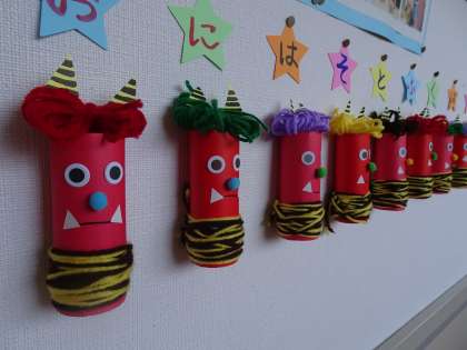 18日(土)に授業参観が行われ、2月3日の節分に向けて「鬼のお面」を作りました。自分で好きな色を選び、「赤〜」「緑〜」と言いながら、頭の部分に貼ることができました。個性あふれる、かわいらしい鬼の顔が完成しました。廊下にも、トイレットロールの芯を使って作った鬼たちが並んでいます。