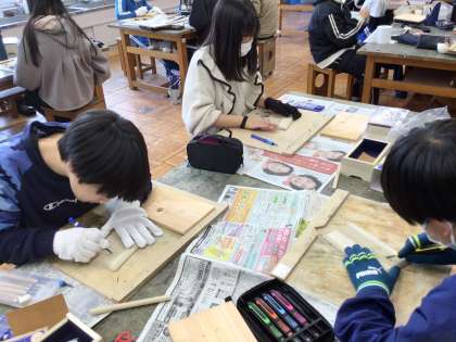 彫刻刀でメモリーボックスを作っています。アニメのキャラクターや自分の名前、好きなマークなどを下書きし、彫刻刀で彫っています。完成が楽しみです♩