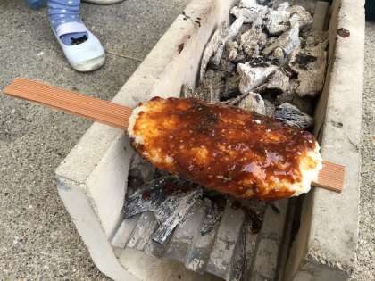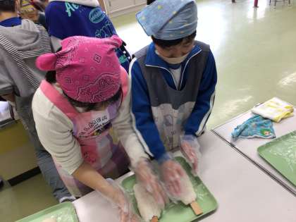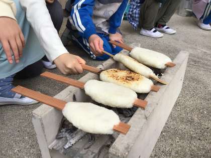 5年生が総合的な学習の時間で学んできた五平餅のまとめとして、五平餅作りの体験を行いました。地域講師の方に来ていただき、五平餅の作り方を教えてもらいました。愛情たっぷりの個性あふれる形の五平餅・・・。給食の後でしたが、みんなぺろりと食べていました。
