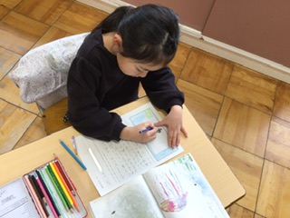 国語で、スイミーの学習をしています。好きな場面を選び、そのわけを話し合っています。単元の1時間目には、選んだ場面の絵も描きました。想像を膨らませて、好きな場面の絵を楽しく描きました。