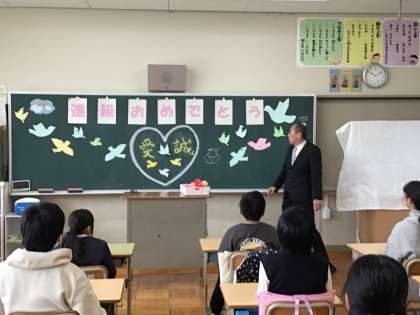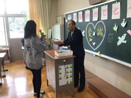 4月8日(火)の入学式、始業式の後に、各教室で「学級開き」がありました。6年生では、担任から「進級おめでとう」の気持ちを込めて、一輪の造花が渡されました。そして、