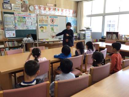 司書の先生に図書室の使い方を教えていただきました。読み聞かせもしていただき、最後にはマナーよく本を借りていました。