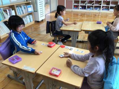 1年 算数 公開日 2025/05/23 更新日 2025/05/23 各学年から 1〜10の数字を習いました。「せーのっ!」でカードを出し、どちらが大きい数か比べるゲームをしました。楽しみながら学習することができました。 1年