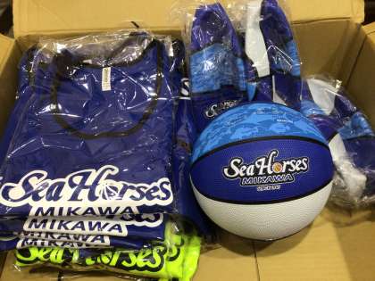 また、「シーホース三河」という地元のバスケチームから、バスケットボール5球とビブス20枚を寄贈していただけました。授業などで活用していきたいと思います。