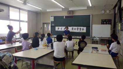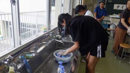 この活動は、「特色のある学校づくりの推進事業」の一環として行われました。6月26日(木)1〜3限に、齋藤和雄氏をお招きして、「タイダイ染め学習会」が、