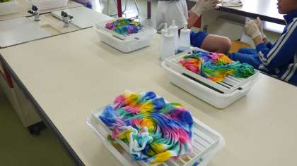 染め方や工夫の仕方を教授してくださいました。事前に、準備していただいたカラフルな