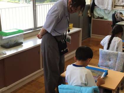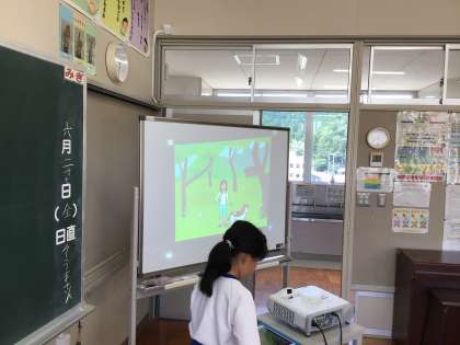 ICT支援員さんに来ていただき、スクラッチJrというアプリでプログラミングの学習をしました。今回のキーポイントは、「場面を変える」。3つ〜4つの場面を作り、お話を作りました。面白い作品ができました。