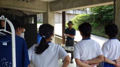 7月7日(月)1〜2限にかけて、斎藤和雄氏宅の作業場を訪れ、「藍染め学習会」をしました。子どもたちは、斎藤先生が藍染めの染料をつくるときの材料の話を興味津々と聞いていました。実際に、茶色い布を染料につけると、藍色の布に変身し、驚いていました。また、素敵な体験ができ、学びが広がりました。齋藤先生、ありがとうございました。、