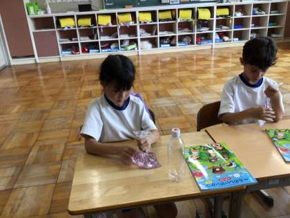 大切にお世話しているあさがおを使って、色水遊びをしました。お花の色や入れた数によっていろいろな濃さの色水ができて、とても楽しく学ぶことができていました。