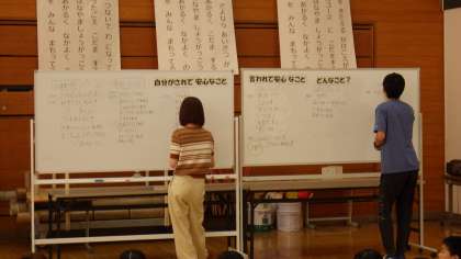 9月9日(火)3時間目に全校道徳が行われました。「だれかにしてもらって安心すること、だれかに言ってもらって心がうれしいこと」をむくろじ班ごとに考え、子どもたち一人ひとりが、意見交換しました。6年生は、司会の進行や意見のとりまとめをして、