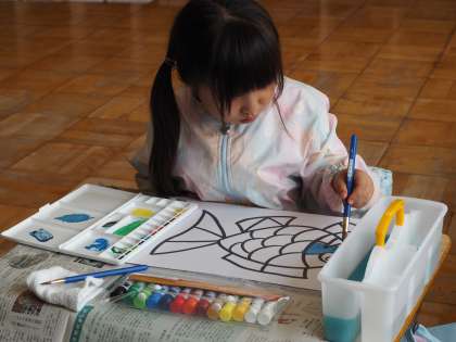 図工の学習で、はじめての絵の具に挑戦しました。「水をたくさん入れると、色が薄くなるよ」「黄色と青を混ぜたら緑になったよ」とたくさんのことに気付いていました。どの子も、にじいろのさかなを完成させようと、うろこを1枚ずつ丁寧に塗っていました。