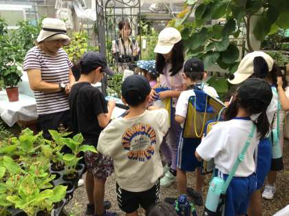 町たんけんでは、秀桝屋さんと高木園芸にも行きました。秀桝屋さんでは、ケーキの作り方を特別に見せていただきました。高木園芸では、たくさんの花や苗の説明を聞きました。にんじんの種も買ったので、秋から育てていきたいです。