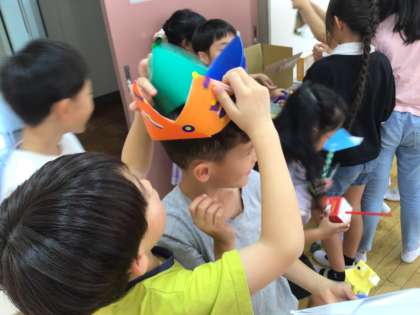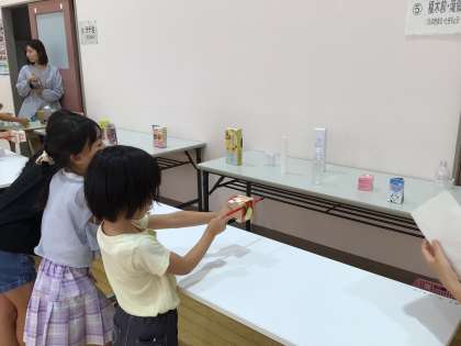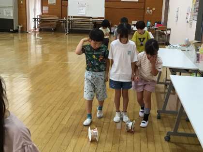 9月25日に、2年生が1年生を招待して、「おもちゃまつり」を開きました。ものづくりプログラムで作ったおもちゃを使って、「がけから落ちるなゲーム」や、「ダーツゲーム」などをして遊びました。2年生が1年生に優しく説明をし、1年生もルールを守ってみんなで楽しく遊ぶことができました。2年生が作った景品も、1年生がとても喜んでくれました。