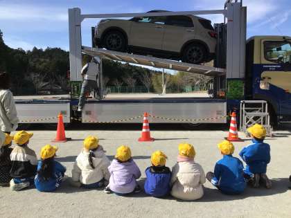 10日に、トヨタ輸送さんの出前授業が行われました。トラック運転手の視界を確認し、手を挙げて横断歩道を渡ることの大切さを学びました。車を3台も積むことができるトラックの迫力はとてもすごかったです。たくさんの質問にも答えていただき、大変勉強になりました。