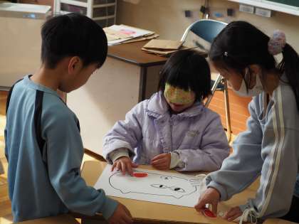 生活科の授業で、お正月遊びの福笑いをしました。自分の好きな生き物やキャラクターの福笑いを作り、みんなで楽しむことができました。廊下に掲示してありますので、授業参観授業参加の際に、ぜひご覧ください。