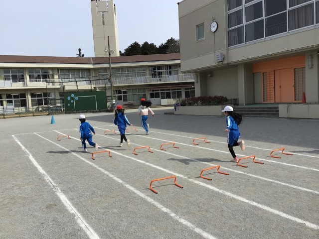 体育の授業で、ミニハードルに挑戦しています。ジャンプを低くしながら、速く走ることを意識して、取り組んでいます。