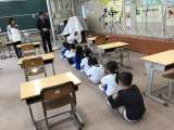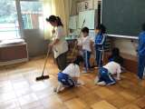 教室掃除を頑張っています。ほうきやぞうきん、それぞれの掃除道具の正しい使い方を...