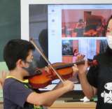 5年生の音楽「音の重なり」の学習で、バイオリンに挑戦しました。