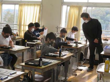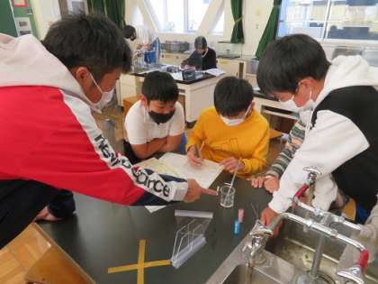 6年1組は理科。理科室で水溶液の実験です。酸性?アルカリ性?リトマス試験紙を初めて使いました。2組は書写。真剣そのものです。