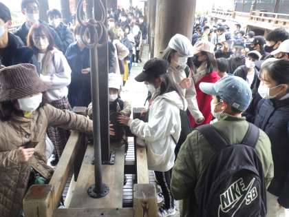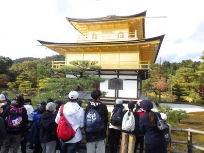 2日目は、京都に行きました。写真は、金閣寺での写真と清水寺にある弁慶が履いていたといわれている下駄を持っている写真です。