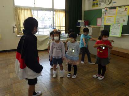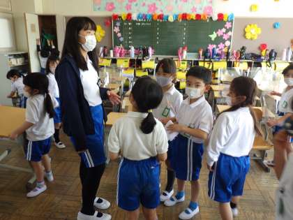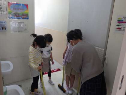 6年生が1年生に掃除の仕方を教えています。教え始めてからそろそろ1か月、1年生も掃除の仕方が上手になってきました。