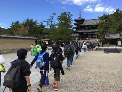 法隆寺を見学しました。踏むとよいことがあるという鯛石を踏んで、中に入りました。今日はとても空いていて、待ち時間もなくスムーズに見学できました。みんな元気にたくさんのおみやげを持って帰ります。