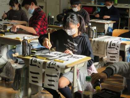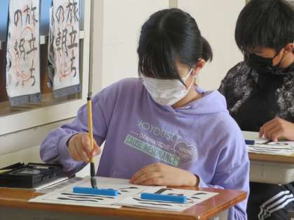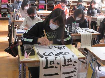 小学校最後の書き初め大会に臨む6年生。