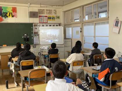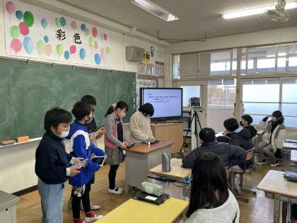 1月18日に5年生が特色ある学校づくり推進事業都市と山間交流として、豊田市の旭地区の小渡小学校と交流を行いました。オンラインで互いの教室をつなぎ、平和小学校はお米を使った料理や米の種類についての発表を自作のパワーポイントを使って発表しました。調べたことを分かりやすくまとめ、アニメーションを駆使したり、クイズを出したりしながら交流を進めました。