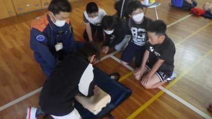 5月11日に中消防署の方をお招きして応急手当講習を開きました。心臓が急に止まってしまう事故は、決して他人ごとではないことを学び、子供たちは、みんな一生懸命になって話を聞いて、心肺蘇生法の方法やAEDの取り付け方などを学んでいました。ぜひご家庭でも学校でどんなことをしたのか話を聞いてみてくださいね