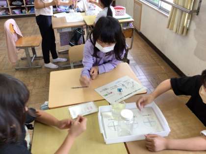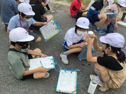 4年生が水源公園近くの矢作川へ行き、水質調査をして水について学びました。汚れた水をどう分解するか、自分たちの生活に結び付けて、考える機会になりました。