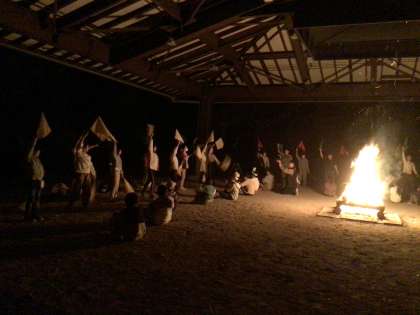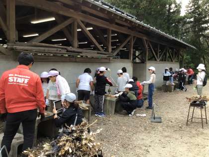 元気にオリエンテーリングを終え、火おこし体験をしました。おこした火でマシュマロを焼いて食べました。上手に焼けてとてもおいしかったです。キャンプファイヤーは、おもしろい場面あり、感動する場面ありで最高でした。