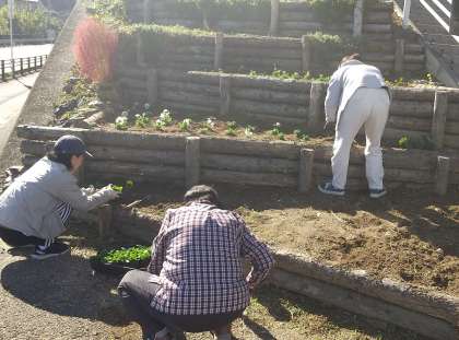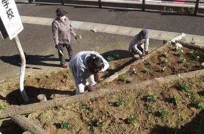 10月31日(火)、秋晴れの中、110階段横花壇のパンジー、ビオラ等の花植えが行われ、保護者のボランティアの方が参加してくださいました。