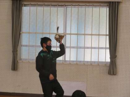 大谷選手からのお手紙を体育主任が読み、6年生二人が、グローブを使ってキャッチボールをしました。
