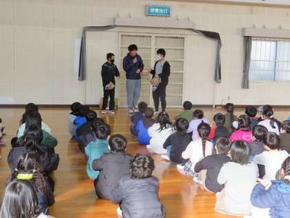 5時間目に、体育館で全校児童に披露しました。