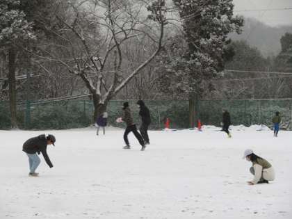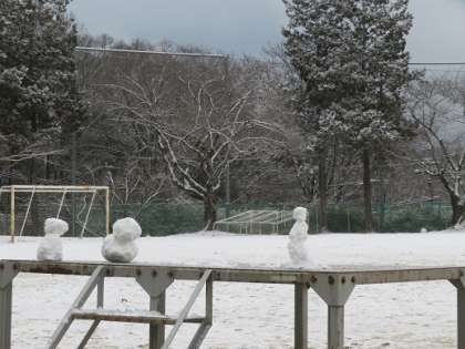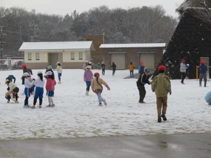 早朝から降る雪が校庭に積もりました。全校で時間を決め、雪遊びをしました。雪だるまを作ったり、雪合戦をしたりして、楽しみました。