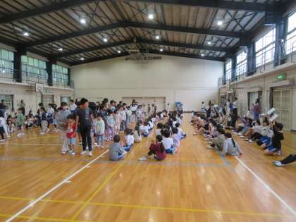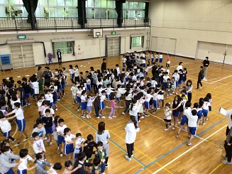 1年生を迎える会を、全校で行いました。縦割り班で集まり、じゃんけん列車を楽しみました。1年間で、もっと仲良くなりましょうね。