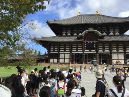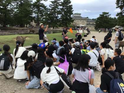 奈良公園では、大仏の大きさに驚いたり、鹿にえさをあげたりしました。天気も良く、体調を崩す人もなく、博物館の見学まで終えることができました。予定通り、法隆寺へ出発します。