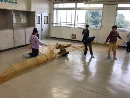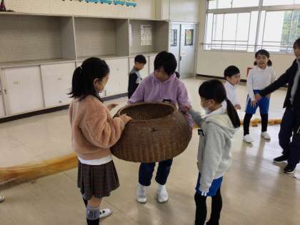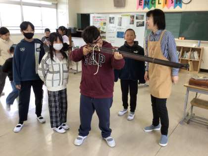 4年生では、国語科「ごんぎつね」の授業があります。図書館司書の下深迫先生が、新美南吉さんについて詳しく教えてくれました。また、物語に出てくる道具「びく」「はりきりあみ」「火縄銃」を実際に触れる体験を行いました。火縄銃を持ってみると「すごく重たい」などという声も上がりました。