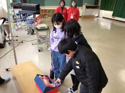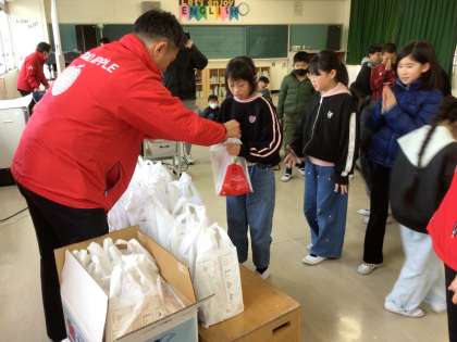 青森県弘前市からりんごのPRに平和小学校に来てくれました。青森県について知るとともに、りんごの育て方から収穫の仕方まで詳しく教えてくれました。青森県がりんごの生産量で有名だということやりんごの種類など、りんごについてたくさんのことを学習しました。また、赤いりんご「ふじ」と緑のりんご「王林」の2種類をもらいました。