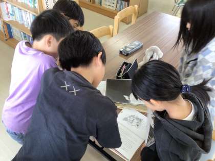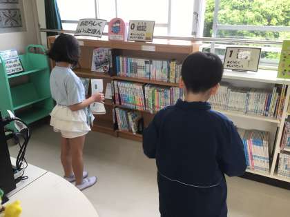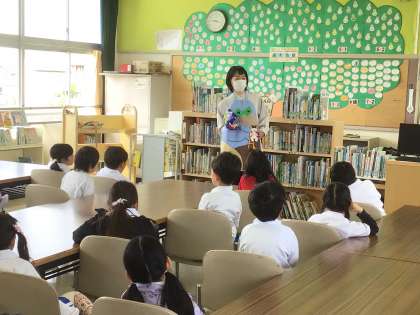 新学期を迎え、平和小学校では各学級ごとに司書さんによる図書館指導を行っています。1年生は、図書館の使い方を学習した後、『おはなしエプロン』を使った『3匹のやぎのがらがらどん』のお話をききました。4年生は、司書さんから与えられた『本を探すミッション』にグループで協力しながら取り組んでいる姿が見られました。