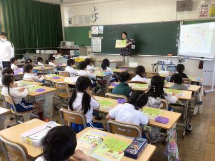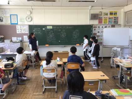 5年生の算数の授業では、立体の体積を求める授業を行いました。自分が考えた求め方を黒板の図を使いながら他の児童に説明するようすが見られました。