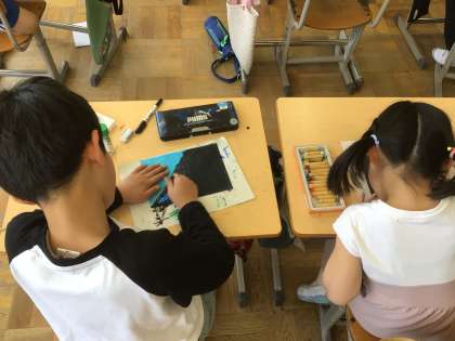 3年生の図工の授業では、スクラッチアートを行いました。黒色のクレヨンを削り、色鮮やかな模様を表現していました。