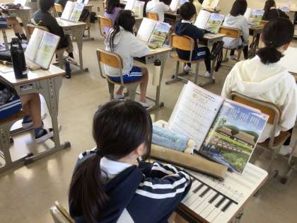 6年生では、リコーダーの練習をしました。演奏する「ふるさと」について、まずは歌詞に込められた思いについて考えました。