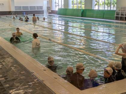 本日より5、6年生を皮切りに、水泳の授業が始まりました。本校では、豊田市の委託を受けた「アイレクス NEO 豊田」にて水泳の授業を行っています。児童はバスで移動し、空調の効いた屋内プールという恵まれた環境で授業を受けました。授業では3つのグループに分かれ、本校教員に加えアイレクスのインストラクターからもご指導も受けました。