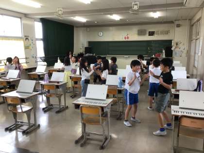 3年生の音楽の授業では、「茶摘みの歌」の学習をしました。拍子記号で示されたリズムを正確にとらえられるよう、手遊びやジャンプをしながら元気いっぱい楽しそうに歌うようすが見られました。
