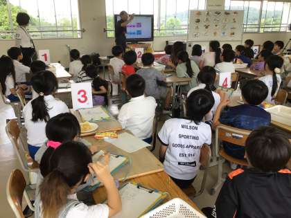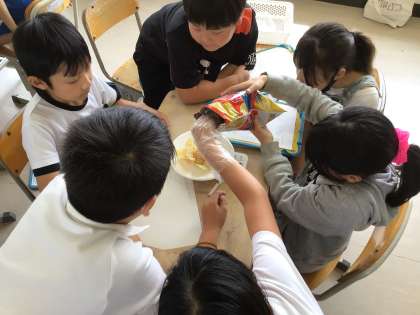 6月13日(金)、4年生がカルビーによる出前授業を受けました。授業では、4、5年生の1日のおやつの目安は200キロカロリーで、ポテトチップではおよそ35グラムであることや、みかんでは、6、7個分のカロリーに相当することなどを学びました。ポテトチップ35グラムの実際の量をグループで協力しながら計りとる児童の姿が見られました。